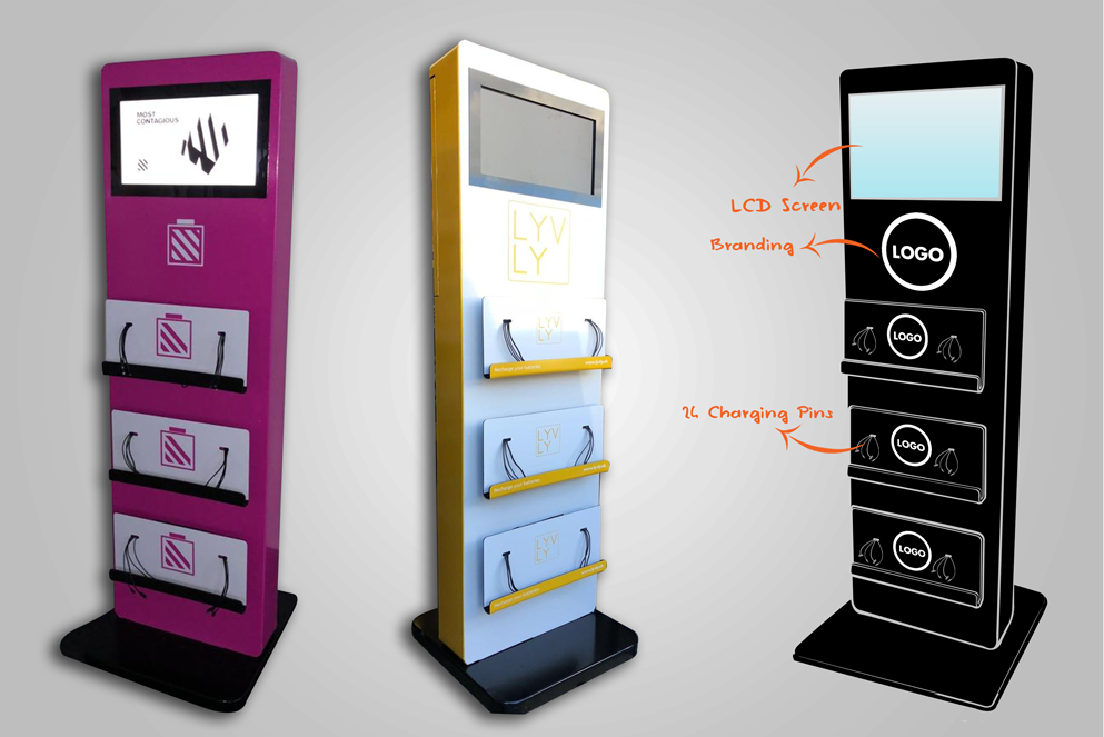 The energy efficient M12 and 16cable mobile phone charging station technology is a wall, table top or freestanding floor stand solution. It is designed and manufactured in Europe with free custom branding, free shipping, user friendly and lifetime warranty .